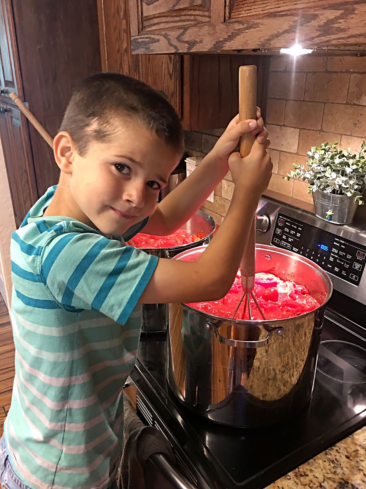 Mashing tomatoes with mama's monster masher is a prize job for many of my little ones. When I am making tomato sauce or spaghetti sauce, I do not peal my tomatoes. I simply quarter my ripe tomatoes and throw them in a large pot. As the tomatoes cook down we mash them to help speed up the process.